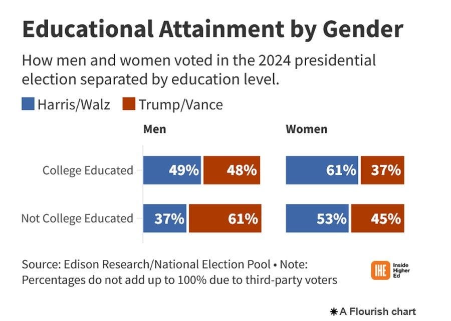 We do not have a gender gap of men and women. We have a gap of men without a college degree going for Trump while single women (with or without a college degree, but especially the college educated) went for Harris. It is much more complicated than a men vs. women sex gap.