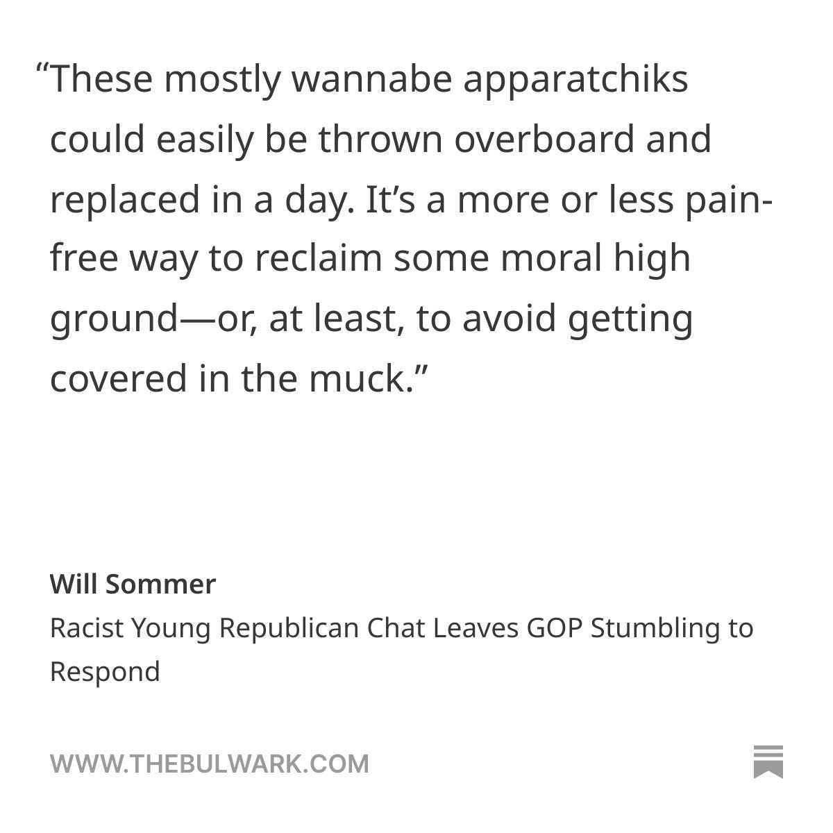 When the news of the Young Republican group chat emerged, with a bunch of twenty-somethings engaged in “edgy” jokes and remarks, something about the demand to denounce them did not sit well with me. In trying to make the case for denouncing them, The Bulwark clarified my thinking: