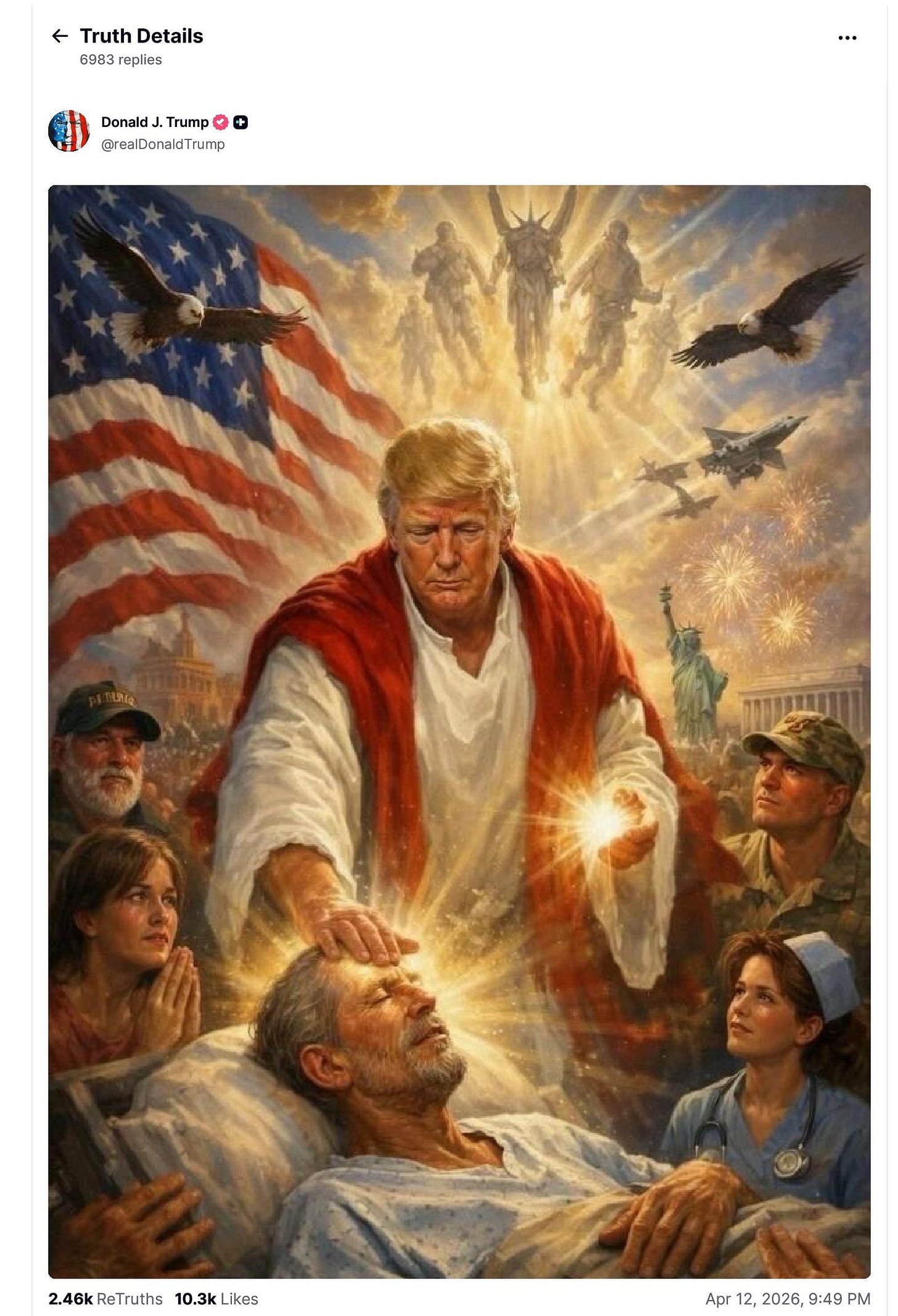 President Trump's blasphemous post serves three purposes. First, it is a loyalty test via a humiliation ritual. The people who beclown themselves defending it are showing their loyalty. Trump loves effusive praise, so creating images like this is a sure fire way to get his attention. Second, it allows Trump supporters to root out "heretics." Finally, it is a way to "own the libs" by angering them against not only President Trump, but against Christians generally. The whole thing is very childish.